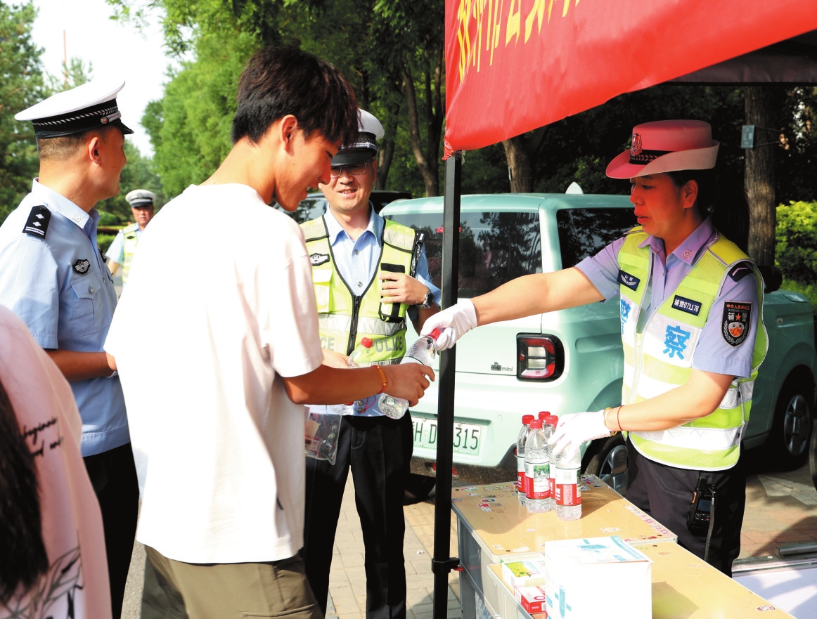 圖為忻州高級中學(xué)考點(diǎn),交警為考生提供貼心服務(wù)。陳勇升攝