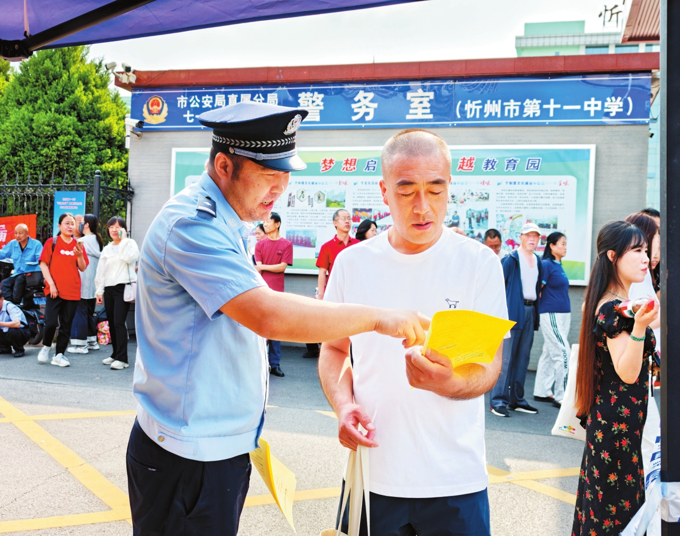 圖為忻州十一中考點(diǎn),民警在宣傳防范電信詐騙知識。馮偉倫攝