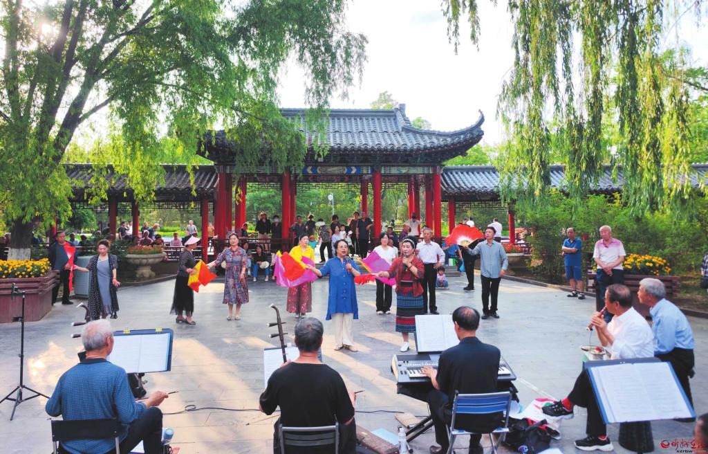 6月9日,在忻州城區(qū)人民公園,老年音樂(lè)愛好者們正一展歌喉,吸引不少市民圍觀。(記者張存良攝)