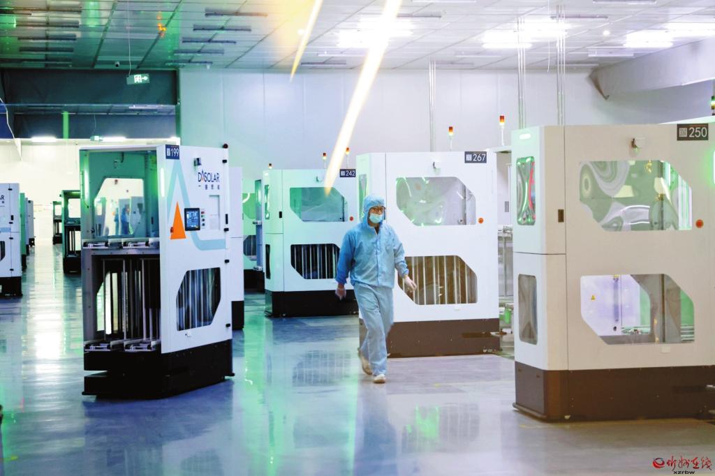 坐落于忻州經(jīng)濟開發(fā)區(qū)的一道新能源科技(忻州)有限公司是一家主要從事高效光伏電池及組件的研發(fā)、制造與銷售,同步覆蓋太陽能發(fā)電技術(shù)服務(wù)、電池制造及太陽能熱利用產(chǎn)品的企業(yè)。該公司構(gòu)建起的“黑燈工廠”級智能化生產(chǎn)線展現(xiàn)出強大的生產(chǎn)能力和高效的運營水平,自主研發(fā)的TOPCon4.0光伏電池量產(chǎn)效率已達26.7%,處于行業(yè)領(lǐng)先。圖為一道新能源智能化生產(chǎn)車間。 (記者 張存良攝)