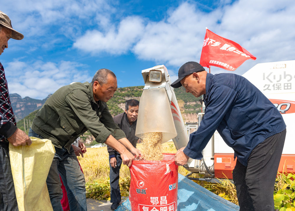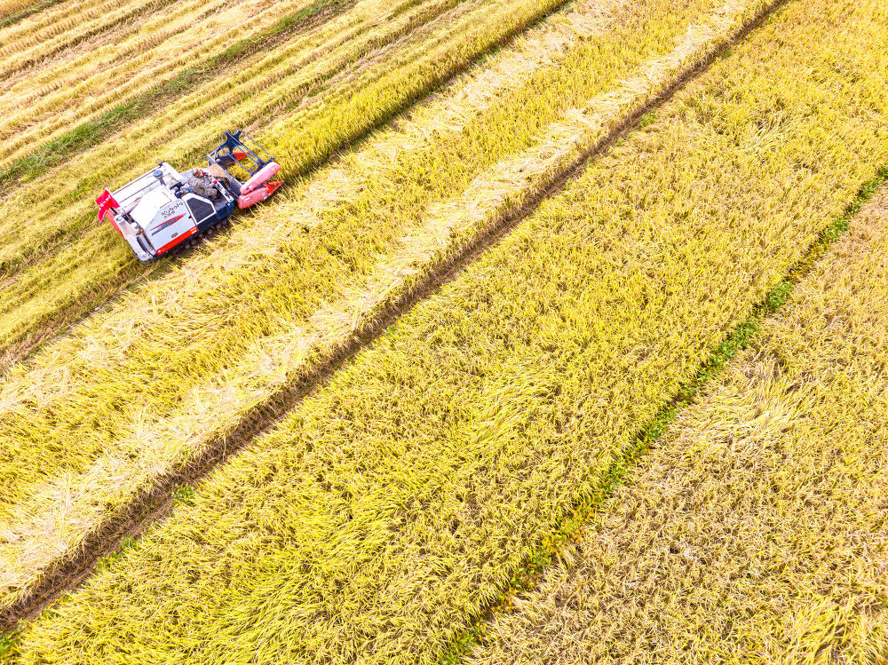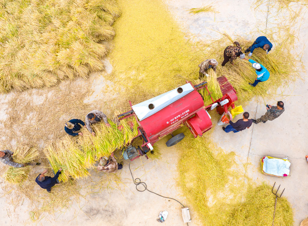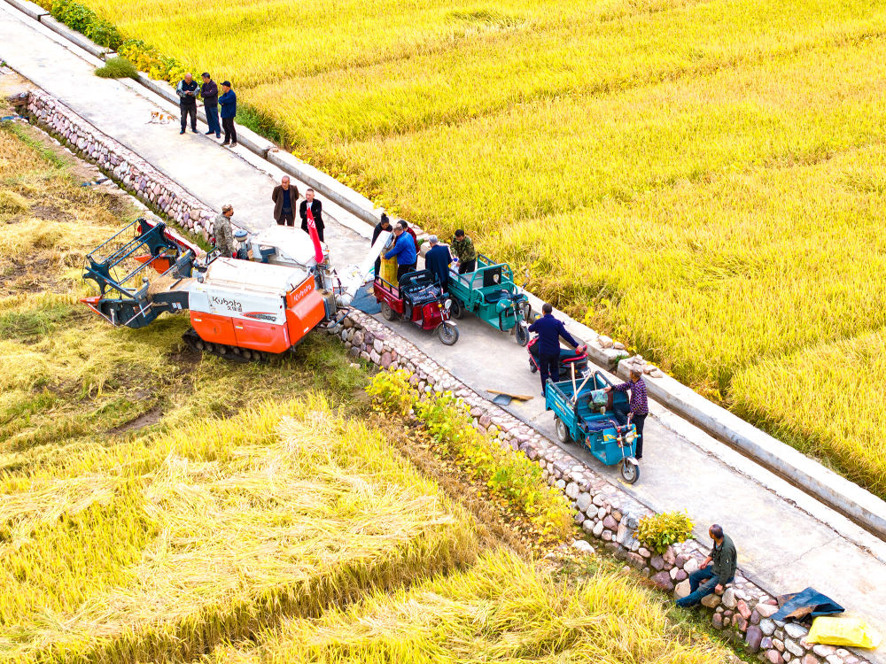 田間地頭,一派繁忙景象。大型收割機(jī)在成片的稻浪中轟鳴穿梭,高效完成收割、脫粒等工序;對于部分因大風(fēng)倒伏的水稻,村民們則彎腰進(jìn)行人工搶收。與此同時(shí),打谷、裝袋、運(yùn)輸……各項(xiàng)工序有條不紊,機(jī)械與人力緊密配合,勾勒出一幅生動(dòng)的秋收畫卷。