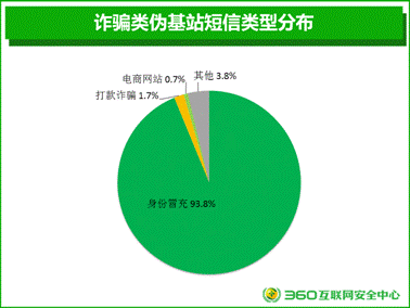那么,什么是偽基站?安全專家介紹,偽基站一般由主機(jī)和筆記本電腦組成,通過偽裝成運(yùn)營商的基站,冒用他人手機(jī)號碼強(qiáng)行向用戶手機(jī)發(fā)送詐騙、廣告推銷等短信息。這種新型犯罪覆蓋范圍廣,遍布全國各地,影響人群多,抓捕難度大,嚴(yán)重危害國家通訊安全和社會秩序。 根據(jù)360互聯(lián)網(wǎng)安全中心發(fā)布的統(tǒng)計(jì),在所有由偽基站發(fā)送的垃圾短信中,廣告推銷類短信數(shù)量最多,占比高達(dá)42.5%;其次為違法信息類、詐騙信息類的短信,占比分別為33.8%和22.8%。 安全人員對詐騙類偽基站短信內(nèi)容進(jìn)行篩選和分析發(fā)現(xiàn),身份冒充類偽基站短信占到了絕大部分,占比為93.8%,打款詐騙(1.7%)、電商網(wǎng)站(0.7%)位列其后。