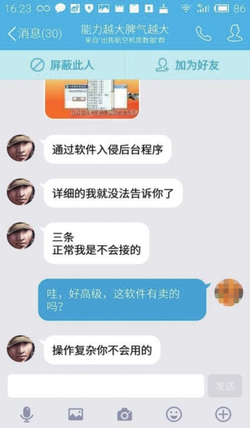 記者以求購(gòu)機(jī)票信息為名在網(wǎng)上找到了十幾名以此為業(yè)的QQ用戶。其中,用戶名為“能力越大脾氣越大”的用戶告訴記者,每條航空機(jī)票信息售價(jià)18元,可以挑選特定的航空公司,買多了,價(jià)格還可以優(yōu)惠。他告訴記者,自己是通過(guò)軟件入侵后臺(tái)程序“調(diào)取”機(jī)票信息,而且都是客戶有需求的時(shí)候才去“調(diào)取”,保證信息新鮮有效。