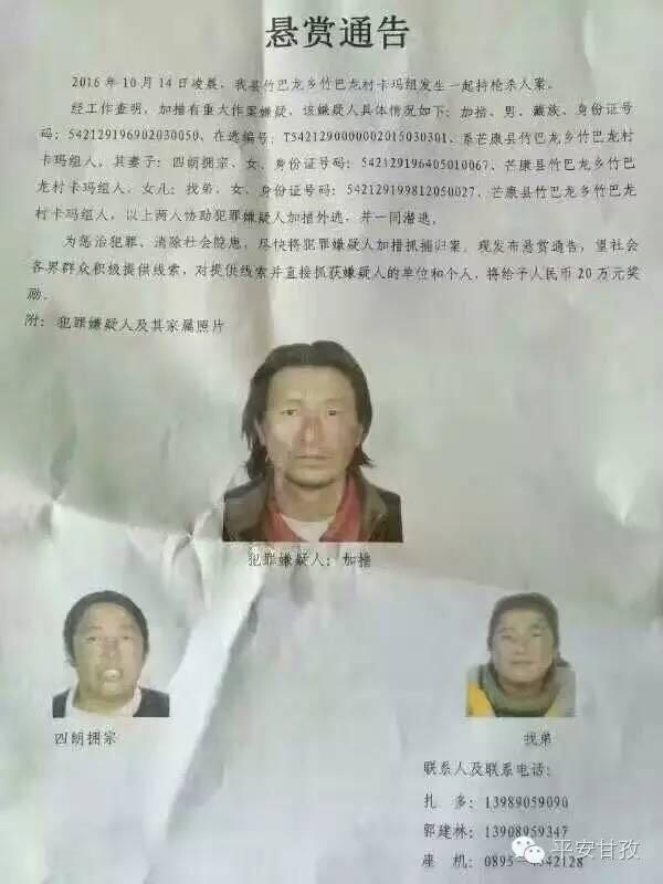 10月18日,甘孜藏族自治州公安局通過官方認(rèn)證微信“平安甘孜”發(fā)布的通緝令顯示,經(jīng)工作查明,加措有重大作案嫌疑。加措生于1969年2月3日,芒康縣竹巴龍鄉(xiāng)竹巴龍村卡瑪組人,在逃編號(hào)為“T5421290000002015030301”。其妻子四朗擁宗和女兒找弟協(xié)助犯罪嫌疑人加措外逃,并一同潛逃。