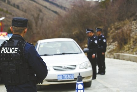 阿壩州警方正在執(zhí)行車輛盤查工作。