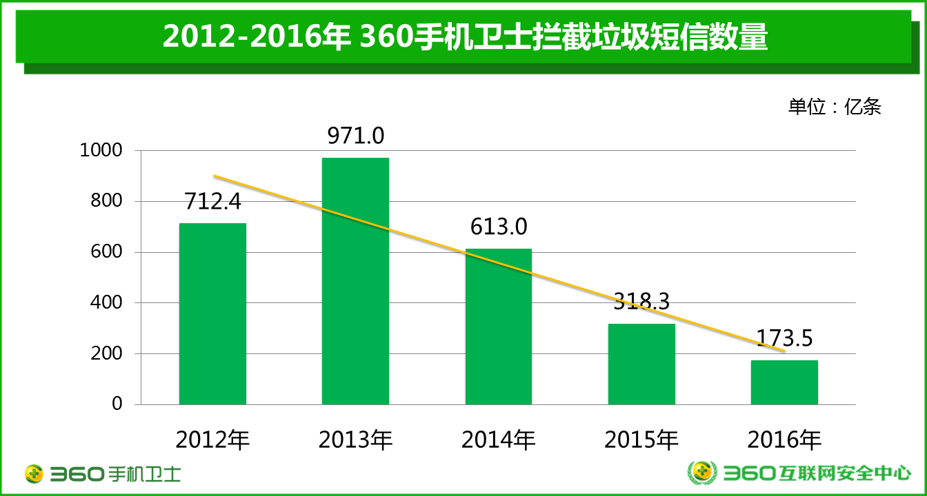 360手機(jī)衛(wèi)士日前發(fā)布的《2016年中國手機(jī)安全狀況報告》顯示,去年360手機(jī)衛(wèi)士共為全國用戶攔截各類垃圾短信約173.5億條,相較于2012年的700多億,降幅高達(dá)75.6%,五年來整體呈現(xiàn)快速下降的趨勢。