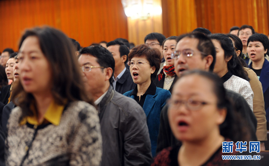 2016年10月21日,紀(jì)念紅軍長征勝利80周年大會(huì)在人民大會(huì)堂舉行。圖為全體起立唱國歌。新華網(wǎng) 陳競超 攝