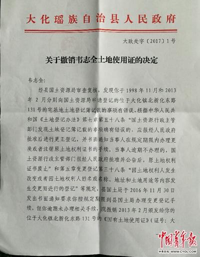 2月9日,大化縣人民政府下發(fā)大政處字〔2017〕1號(hào)文《關(guān)于撤銷韋志全土地使用證的決定》。 中國青年報(bào)·中青在線記者 謝洋/攝