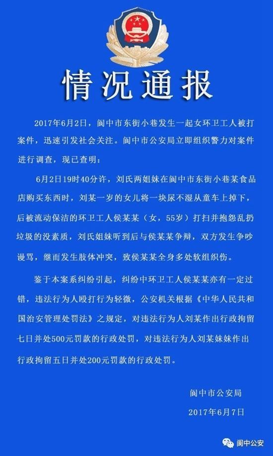 四川在線消息(記者 伍力 )因?yàn)橐黄虿粷褚鸺m紛,閬中市兩名年輕女子與一名環(huán)衛(wèi)工人發(fā)生肢體沖突。事件發(fā)生后,引發(fā)廣泛關(guān)注。6月7日,閬中市公安局發(fā)布情況通報(bào),通報(bào)如下。 6月2日,閬中市東街小巷發(fā)生一起女環(huán)衛(wèi)工人被打案件,迅速引發(fā)社會(huì)關(guān)注。閬中市公安局立即組織警力對(duì)案件進(jìn)行調(diào)查,現(xiàn)已查明: 6月2日19時(shí)40分許,劉氏兩姐妹在閬中市東街小巷某食品店購(gòu)買東西時(shí),劉某一歲的女兒將一塊尿不濕從童車上掉下,后被流動(dòng)保潔的環(huán)衛(wèi)工人侯某某(女,55歲)打掃并抱怨亂扔垃圾的沒(méi)素質(zhì),劉氏姐妹聽到后與侯某某爭(zhēng)辯,雙方發(fā)生爭(zhēng)吵謾罵,繼而發(fā)生肢體沖突,致侯某某全身多處軟組織傷。 鑒于本案系糾紛引起,糾紛中環(huán)衛(wèi)工人侯某某亦有一定過(guò)錯(cuò),違法行為人毆打行為輕微,公安機(jī)關(guān)根據(jù)《中華人民共和國(guó)治安管理處罰法》之規(guī)定,對(duì)違法行為人劉某作出行政拘留七日并處500元罰款的行政處罰,對(duì)違法行為人劉某妹妹作出行政拘留五日并處200元罰款的行政處罰。