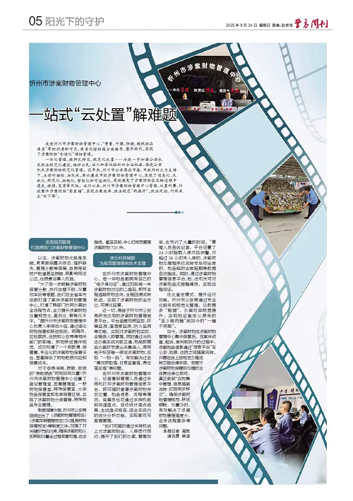 走進(jìn)忻州市涉案財(cái)物管理中心,“貴重、干燥、防磁、超規(guī)物品庫房”等標(biāo)識清晰可見,庫房內(nèi)儲(chǔ)物箱分類編號、整齊排列,實(shí)現(xiàn)了涉案財(cái)物“倉儲(chǔ)化”精細(xì)管理。 一體化管理、換押式移交、規(guī)范化處置……為進(jìn)一步加強(qiáng)公安機(jī)關(guān)執(zhí)法規(guī)范化建設(shè),維護(hù)公民、法人和其他組織的合法權(quán)益,推進(jìn)公安機(jī)關(guān)涉案財(cái)物規(guī)范化管理。近年來,忻州市公安局在市委、市政府的大力支持下,主動(dòng)對接檢、法機(jī)關(guān),牽頭建成市級涉案財(cái)物管理中心,實(shí)現(xiàn)了信息化、無紙化、規(guī)范化、物聯(lián)化、智能化和可追溯化,有效避免了涉案財(cái)物在流轉(zhuǎn)過程中遺失、破損、變質(zhì)等風(fēng)險(xiǎn)。運(yùn)行以來,忻州市涉案財(cái)物管理中心管理、處置刑事、行政案件涉案財(cái)物“零差錯(cuò)”,實(shí)現(xiàn)辦案效率、執(zhí)法規(guī)范“兩提升”,執(zhí)法風(fēng)險(xiǎn)、行政成本“雙下降”。 實(shí)現(xiàn)規(guī)范管理 打造跨部門涉案財(cái)物管理中心 以往,涉案財(cái)物尤其是車輛,常常面臨露天存放、維護(hù)缺失、管理分散等困境,容易導(dǎo)致財(cái)產(chǎn)貶值甚至損毀,既影響司法公正,也損害當(dāng)事人權(quán)益。 “為了進(jìn)一步破解涉案財(cái)物保管分散、執(zhí)行依據(jù)不明、處置效率低等難題,我們在全省率先創(chuàng)新打造了案件涉案財(cái)物管理中心,打通了跨部門協(xié)同辦案的全流程節(jié)點(diǎn),全力提升涉案財(cái)物處置規(guī)范化、高效化、智能化水平?!睋?jù)忻州市涉案財(cái)物管理中心負(fù)責(zé)人李鴻劍介紹,通過細(xì)化財(cái)物保管和移送規(guī)則,明確市、區(qū)檢察院、法院和公安局等相關(guān)部門的職能、財(cái)物移送操作規(guī)范,成功構(gòu)建了一個(gè)底數(shù)清、保管善、專業(yè)化的涉案財(cái)物保管平臺(tái),顯著降低了財(cái)物貶損風(fēng)險(xiǎn)和保管成本。 對于容易消耗、損毀、變質(zhì)的“易貶損類”財(cái)物如何處置?忻州市涉案財(cái)物管理中心設(shè)置了登記管理室、密集管理室、一般財(cái)物保管室、特殊保管室、大宗物品保管室和車庫保管區(qū)域,實(shí)現(xiàn)了涉案財(cái)物分類管理,特殊物品專業(yè)管理。 制度保障方面,忻州市公安局陸續(xù)出臺(tái)了《涉案財(cái)物管理規(guī)定》《涉案車輛管理規(guī)定》及《隨身財(cái)物保管規(guī)定》等制度文件,加強(qiáng)了對關(guān)鍵環(huán)節(jié)的約束,確保涉案財(cái)物從扣押到處置全過程有章可循、依法推進(jìn)。截至目前,中心已規(guī)范管理涉案財(cái)物720件。 突出科技賦能 為規(guī)范管理提供技術(shù)支撐 在忻州市涉案財(cái)物管理中心,每一件物品都擁有自己的“電子身份證”。通過掃碼每一件涉案財(cái)物對應(yīng)的二維碼,即可全程追蹤財(cái)物去向,全程回溯流轉(zhuǎn)軌跡,實(shí)現(xiàn)了涉案財(cái)物的全方位、可溯化監(jiān)管。 這一切,得益于忻州市公安局研發(fā)應(yīng)用的涉案財(cái)物管理信息平臺(tái)。平臺(tái)涵蓋視頻監(jiān)控、環(huán)境監(jiān)測、溫濕度監(jiān)測、防火監(jiān)測等功能,實(shí)現(xiàn)對涉案財(cái)物實(shí)時(shí)、全程錄入和管理。同時(shí)通過與執(zhí)法辦案系統(tǒng)關(guān)聯(lián)互通,物品數(shù)據(jù)由辦案環(huán)節(jié)源頭采集錄入,使用電子標(biāo)簽唯一綁定涉案財(cái)物,實(shí)現(xiàn)“一物一碼”,有效解決過去“情況獲取難、日常監(jiān)督難、責(zé)任落實(shí)難”等問題。 在忻州市涉案財(cái)物管理中心,記者看到管理人員通過手持機(jī)打開涉案財(cái)物管理信息平臺(tái),即可隨時(shí)查看涉案財(cái)物存放位置、物品信息、流程等情況,保管員也可通過手持機(jī)做到快速盤點(diǎn),自動(dòng)統(tǒng)計(jì)盤點(diǎn)結(jié)果,生成盤點(diǎn)報(bào)告,結(jié)合系統(tǒng)內(nèi)的統(tǒng)計(jì)分析功能,實(shí)現(xiàn)高效無差錯(cuò)管理。 “我們可隨時(shí)通過手持機(jī)線上對涉案財(cái)物出、入庫進(jìn)行預(yù)約,提升了我們的辦案、管理效率,也節(jié)約了大量的時(shí)間?!惫芾砣藛T告訴記者,平臺(tái)設(shè)置了24小時(shí)超期入庫風(fēng)險(xiǎn)預(yù)警,對超過24小時(shí)未入庫的、涉案財(cái)物處理程序已流轉(zhuǎn)完畢可出庫的、物品臨時(shí)出庫超期等數(shù)據(jù)自動(dòng)推送。同時(shí),通過涉案財(cái)物管理信息平臺(tái),檢、法機(jī)關(guān)可對涉案物品無接觸調(diào)用,實(shí)現(xiàn)遠(yuǎn)程視證。 優(yōu)化鑒定模式、提升運(yùn)行效能。忻州市公安局通過專業(yè)化服務(wù)和規(guī)范化管理,讓數(shù)據(jù)多“跑腿”,辦案效率明顯提升,實(shí)現(xiàn)物證鑒定從原來的“至少跑兩趟”到如今的“一趟不用跑”。 如今,涉案財(cái)物在涉案財(cái)物管理中心集中保管后,在案件偵查、起訴、審判和執(zhí)行的過程中,涉案物品信息通過“信息平臺(tái)”在公安、檢察、法院之間隨案流轉(zhuǎn)。只需在線上按規(guī)定辦理流轉(zhuǎn)交接法律手續(xù),變更對涉案財(cái)物保管和處理的主體責(zé)任單位即可,