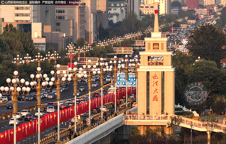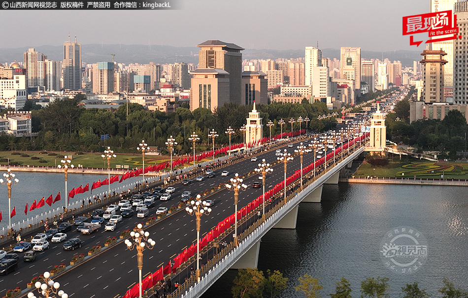 山西太原:迎澤橋 “中國紅”引打卡 國慶氛圍拉滿
