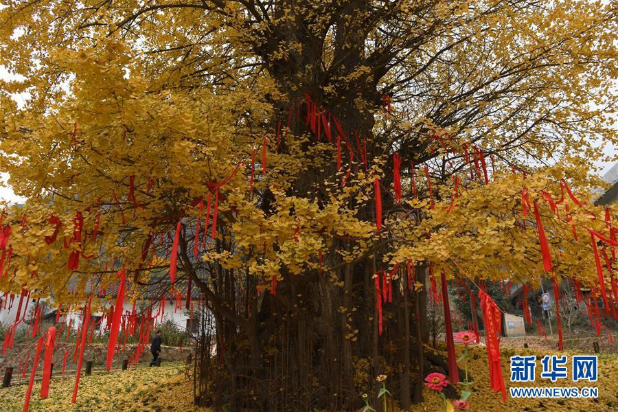 11月19日,游客在留壩縣玉皇廟鎮(zhèn)參觀千年銀杏樹。初冬時節(jié),在秦嶺深處的陜西省留壩縣玉皇廟鎮(zhèn)石窯壩村,一棵千年古銀杏樹的落葉宛如金色地毯,甚為壯觀。據當地林業(yè)部門介紹,該樹胸徑為4.45米,現(xiàn)有高度29米。新華社記者 陶明 攝