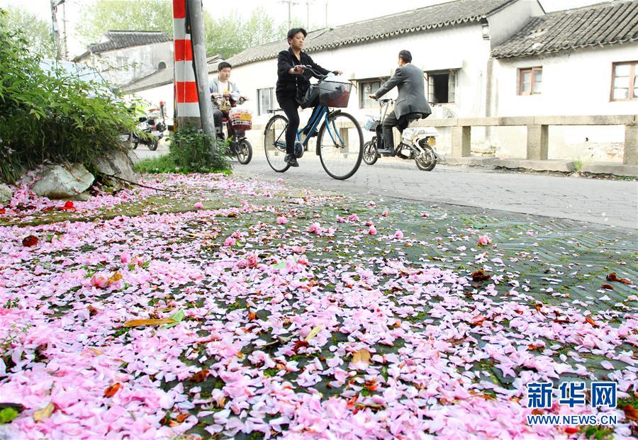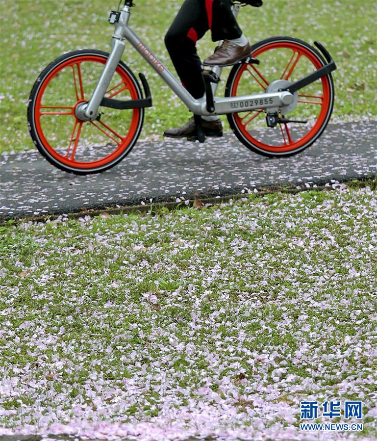 4月17日,一場春雨過后,蘇州市民騎車經(jīng)過落滿櫻花的盛家?guī)贰P氯A社發(fā)(王建中 攝)