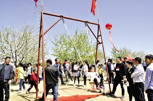 4月23日,為了進一步鞏固脫貧成效,提升鄉(xiāng)村旅游品牌效應,展示當?shù)靥厣r(nóng)產(chǎn)品和黃土高原的風土人情,保德縣楊家灣鎮(zhèn)段家溝村隆重舉辦了首屆美麗鄉(xiāng)村賞花攝影節(jié)。圖為前來賞花的游客正在蕩秋千。(劉澤宇 攝)