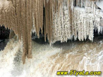 由于四季氣候和水量的差異,壺口景色也時有所變。壺口的春秋兩季,景象也甚為奇特,有氣為虹,橫浮水上,形成了“岸旁無虹掛長雨”的景觀。春回大地的時候,漫山遍野的山桃花盛開,黃河冰岸消融,水量適度平穩(wěn),主瀑、副瀑連成一片,看主瀑云霧迷蒙,望副瀑萬壑千流,觀“龍槽”如巨龍掀浪,稱為“三月桃花汛”;秋季9-11月份雨季剛過去時,河邊眾多山泉小溪,匯集大量清流,陣陣秋風吹過,常有彩虹出現(xiàn),叫做“壺口秋風”。明陳維藩《壺口秋風》詩有“秋風卷起千層浪,晚日迎來萬丈紅”句,可謂真實寫照。這兩個時期,水大而穩(wěn),瀑布寬度可達千米左右。主瀑難以接近,但遠遠望去,煙波浩淼,威武雄壯。大浪卷著水泡,奔騰咆哮,以翻江倒海之勢,飛流而下。壺口的冬日,又是一種奇觀:壺口兩側(cè),冰簾垂掛,晶瑩剔透,格外誘人,農(nóng)歷小雪,大雪前后,上游漂流下來的大冰塊,落入壺口平緩處,冰塊相交,冰峰凍結(jié),冰橋天然合成,人履冰橋,如走坦途,人們稱為“壺口叉橋”。在天橋村附近,積冰成橋,冰橋下激流滾滾,濤聲大作,人們稱之為“天橋”。 在“龍槽”兩側(cè)的石岸上,有鳥蟲的圖案,它們都是古代化石。另外石坂上還有許多大大小小的圓形石窩,淺的1尺,深的數(shù)米,小的碗口大,大的如甕口。這些石窩中,紅沙土沉底,清水浮面,伸頭觀望,觀者的相貌清晰可見,因而這里的人們把它們稱作“石窩寶鏡”?!笆C寶鏡”的形成,漫長的歲月,它是黃河急流不停地沖擊石塊盤旋磨蝕而成的,因此每個石窩中都有一個圓形石頭。每個對“鏡”照面的游人無不為大自然的神奇和力量而浮想聯(lián)翩。一方是山石,一方是水流,從荒古以降,彼此之間在這里不間斷地較量著,水流撞擊山石,山石阻擋水流,這種猛烈的撞擊,造就了我們眼前這深切的“龍槽”。據(jù)唐代《無和郡縣志》中的記載,壺口距其南西的孟門1000步,約合1600米,今天的壺口已距孟門約有3000米,并且仍以每年平均3-4厘米的速度向北移動。這是多么巨大的自然力量,它無堅不摧,無往不勝,無窮無盡,無止無休,這正是我們?nèi)A夏民族永不低頭、頑強不屈性格的寫照。