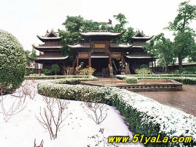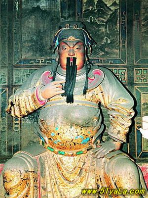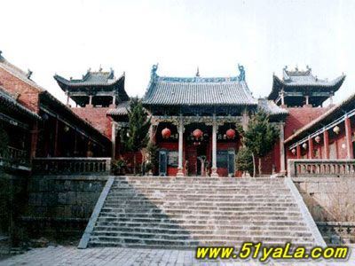 前行有午門(mén).是一座面闊五間,單檐廡殿頂、石雕回廊的廳式建筑。周?chē)惺瘷跅U,欄板正反兩面浮雕各類圖案、人物144幅,洋洋大觀,頗有童趣。廳內(nèi)南有周倉(cāng)、廖化畫(huà)像,軒昂威武。北面左右兩側(cè),彩繪著關(guān)羽戎馬一生的主要經(jīng)歷,起于桃園三結(jié)義,止于水淹七軍,只是沒(méi)有走麥城這個(gè)情節(jié),在全國(guó)關(guān)廟壁畫(huà)中都按此進(jìn)行,據(jù)說(shuō)這是因忌諱關(guān)羽自高自大而被殺,終于造成蜀國(guó)的覆滅而隱去的。穿過(guò)午門(mén),經(jīng)“山海鐘靈”坊、御書(shū)樓,便是關(guān)帝廟主體建筑崇寧殿。