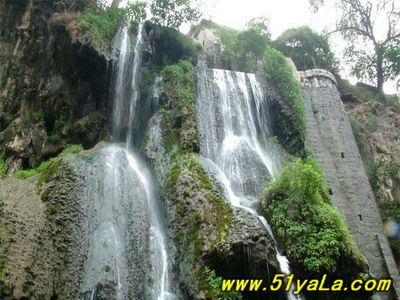 娘子關(guān)瀑布,是澤發(fā)水的源頭,人稱水簾洞,山坡谷中泉眼累累,形成懸泉。瀑布由多股泉水匯流而成,沿懸崖峭壁傾瀉而下,懸空如白練掛在石壁前,形成高達(dá)十幾丈高的飛流?!昂Q邸笔亲畲蟮娜郏瓭L,激起層層浪花,響聲震耳。瀑布旁有“趵突泉”突突噴涌,并有諸多小“趵突泉”相映襯。一股股水流噴吐冒出,浪花紛飛,日夜不息,常年涌流,給娘子關(guān)風(fēng)光增色不少。