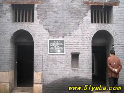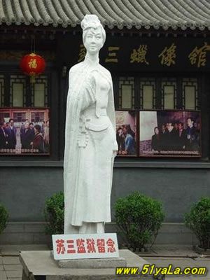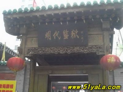 “蘇三監(jiān)獄”在今洪洞縣政府院內(nèi)西南,亦即明洪洞縣衙西南角。一進(jìn)掛有“明代監(jiān)獄”匾額的大門,首先看到的便是蘇三的塑像,外院當(dāng)年監(jiān)獄的辦公場(chǎng)所,右邊的院落是普通監(jiān)牢,中間是過道,兩邊共有監(jiān)牢十余間,過道頂上布有鐵絲網(wǎng),網(wǎng)上掛有銅鈴,一有犯人企圖越墻逃跑,便會(huì)觸響銅鈴。過道的盡頭,正對(duì)的是獄卒的值班室,右面的墻上有獄神的供位,傳說當(dāng)年囚犯入獄都要參拜獄神,就是獄神下面的墻基處,有一小洞,是當(dāng)年運(yùn)送尸體的出口,犯人在獄中病死或是被打死,是不能從大門抬出去的,只能從這個(gè)小洞拉出去。過道盡頭的左邊,便是死囚牢的大門,死囚牢雙門雙墻,門上畫有狴犴,狴犴是龍的兒子,長(zhǎng)得卻象老虎,因此人們誤稱為“虎頭牢”,大約是因?yàn)辇埳抛?,子子不同,狴犴專門掌管刑獄,大門只有一米六高,所有進(jìn)入死囚牢的人都要在狴犴像前低頭,顯示對(duì)法律的敬畏。進(jìn)了門洞,里面還有一道門,而這兩道門卻是一扇從右開,一扇從左開,不明就里的囚犯如果越獄,往往出了第一道門卻怎么也打不開第二道門,一個(gè)小小的改動(dòng)就能起到拖延犯人越獄時(shí)間的作用,不能不佩服古人的智慧。進(jìn)入死牢院,右面是一堵高墻,左面就是當(dāng)年關(guān)押蘇三的牢房,里面有蘇三的塑像。死囚院的中央還有當(dāng)年蘇三坐監(jiān)時(shí)洗衣的水井和石槽,井口留有一道道繩索磨下的印記,井口只有半尺多寬,這是為了防止死囚投井自殺。據(jù)說,右面的高墻里灌裝的都是流沙,如果犯人想要挖墻越獄,流沙便會(huì)從挖開的小口中源源不斷地流來,使其難以挖通圍墻。1964年我國(guó)著名考古學(xué)家王冶秋先生曾在洪洞考察確認(rèn),蘇三監(jiān)獄為我國(guó)罕見的明代監(jiān)獄,并題詩(shī)曰:“虎頭牢里羈紅妝,一曲攪亂臭水漿。王三公子今何在?此處空留丈八墻?!笔陝?dòng)亂期間,蘇三監(jiān)獄被拆毀。為了使“蘇三監(jiān)獄”這一僅存的明代監(jiān)獄得以保留,洪洞縣人民政府后做出了修復(fù)“明代蘇三監(jiān)獄”的決定。修復(fù)事宜于1984年5月開始,同年10月竣工。