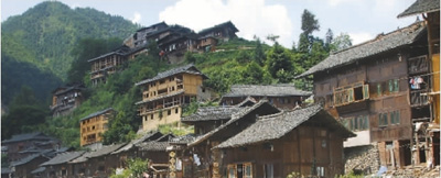 走進(jìn)寨門,我不禁被千戶苗寨的規(guī)模龐大和氣勢恢弘所折服。層層疊疊的吊腳木樓,從河兩岸依著山勢,迤邐向上展開。左邊兩座山上吊角樓星羅棋布、錯(cuò)落有致、層層相疊,已找不出山體的顏色。典雅的吊角樓映襯于鮮花綠樹之間,更顯清秀、端莊。黑色的瓦鋪成的屋頂,更彰顯苗寨的古樸,暗黃色的楓木板壁,在陽光下發(fā)著熠熠金光。