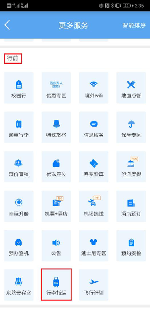 2.進(jìn)入【行前】界面,點擊【行李托運(yùn)】