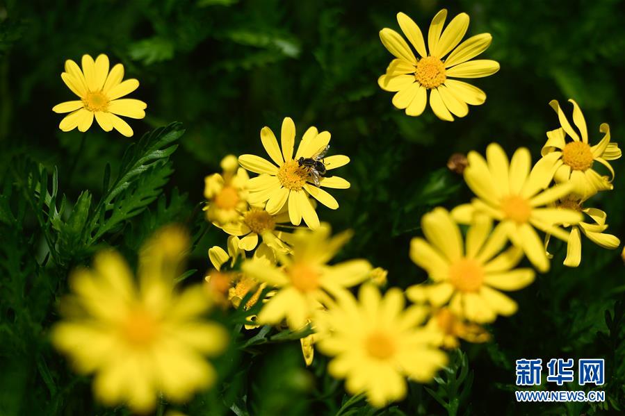 4月26日,蜜蜂在西溪濕地一片盛開的黃金菊上采蜜。 近日,第十屆“西溪花朝節(jié)”在杭州西溪國家濕地公園舉辦,沿著綠堤布置的百萬盆花卉次第綻放,呈現(xiàn)出一片片“浪漫花?!钡木跋蟆?新華社記者 黃宗治 攝