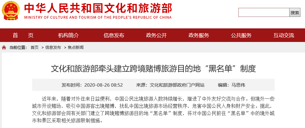 新華網(wǎng)北京8月26日電(記者 薛楓)據(jù)文化和旅游部網(wǎng)站消息,近年來(lái),隨著對(duì)外往來(lái)日益便利,中國(guó)公民出境旅游人數(shù)持續(xù)增長(zhǎng),增進(jìn)了中外友好交流與合作。但境外一些城市開(kāi)設(shè)賭場(chǎng),吸引中國(guó)游客出境賭博,擾亂中國(guó)出境旅游市場(chǎng)經(jīng)營(yíng)秩序,危害中國(guó)公民人身和財(cái)產(chǎn)安全。據(jù)此,文化和旅游部會(huì)同有關(guān)部門建立了跨境賭博旅游目的地“黑名單”制度,將對(duì)中國(guó)公民前往“黑名單”中的境外城市和景區(qū)采取相關(guān)旅游限制措施。