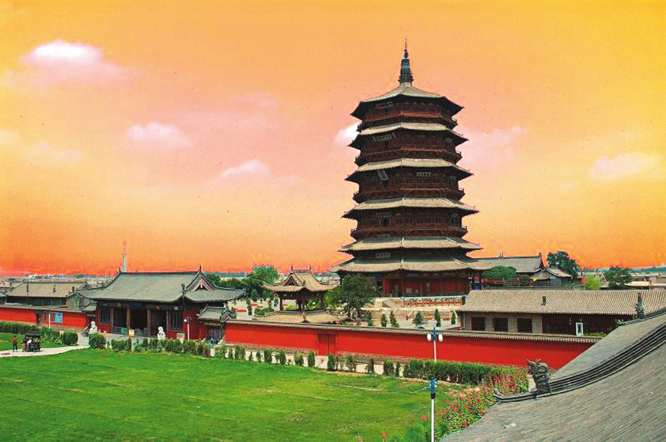 應(yīng)縣木塔是佛宮寺主要建筑之一,佛宮寺從南至北,中軸突出,最南為四柱三樓懸山式木牌樓,向里為山門,后東西兩側(cè)建鐘、鼓二樓,構(gòu)造相同,上下兩層,單檐歇山卷棚頂,下出圍廊與東西配殿相連,中部即為釋迦塔。