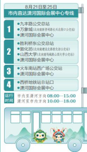 太原市將在山西文博會(huì)期間開通5條免費(fèi)公交接駁專線。其中,4條市內(nèi)直達(dá)瀟河國際會(huì)展中心的專線,分別從九豐路公交總站—萬象城(北向南新晉祠路長興北街口公交站)—瀟河國際會(huì)展中心;勝利橋東公交總站—敦化坊(北向南建設(shè)北路敦化坊公交站)—山西大學(xué)(北向南塢城路山西大學(xué)公交站)—瀟河國際會(huì)展中心;火車南站西廣場(chǎng)公交站—瀟河國際會(huì)展中心;西橋地鐵站B站口—瀟河國際會(huì)展中心。運(yùn)行時(shí)間為市內(nèi)至瀟河方向8:00—15:00,瀟河至市內(nèi)方向10:00—18:00。此外,為便于駕車自行前往的市民出行,還開通了1條社會(huì)停車場(chǎng)至山西瀟河國際會(huì)展中心的免費(fèi)接駁線路。該線路從先行路瀟河大街口經(jīng)先行路至?xí)怪行耐颠\(yùn)行,在智慧南街口、先行路樂商街口停靠,運(yùn)行時(shí)間為9:00—18:00。
