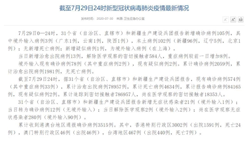 人民網(wǎng)北京7月30日電(董童)國家衛(wèi)生健康委于今日在官網(wǎng)發(fā)布的《截至7月29日24時新型冠狀病毒肺炎疫情最新情況》(以下簡稱“情況”)提出,7月29日0—24時,31個?。ㄗ灾螀^(qū)、直轄市)和新疆生產(chǎn)建設(shè)兵團(tuán)報告新增確診病例105例,其中境外輸入病例3例(廣東1例,云南1例,陜西1例),本土病例102例(新疆96例,遼寧5例,北京1例);無新增死亡病例;新增疑似病例1例,為境外輸入病例(在上海)。當(dāng)日新增治愈出院病例13例,解除醫(yī)學(xué)觀察的密切接觸者584人,重癥病例較前一日增加8例。