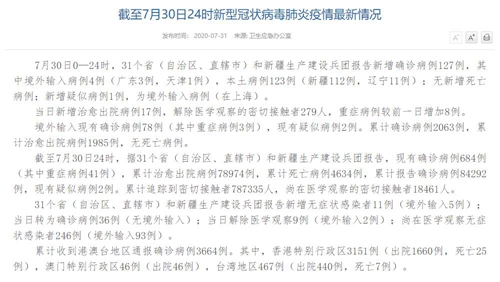 人民網(wǎng)北京7月31日電(董童)國家衛(wèi)生健康委于今日在官網(wǎng)發(fā)布的《截至7月30日24時(shí)新型冠狀病毒肺炎疫情最新情況》(以下簡稱“情況”)提出,7月30日0—24時(shí),31個(gè)?。ㄗ灾螀^(qū)、直轄市)和新疆生產(chǎn)建設(shè)兵團(tuán)報(bào)告新增確診病例127例,其中境外輸入病例4例(廣東3例,天津1例),本土病例123例(新疆112例,遼寧11例);無新增死亡病例;新增疑似病例1例,為境外輸入病例(在上海)。當(dāng)日新增治愈出院病例17例,解除醫(yī)學(xué)觀察的密切接觸者279人,重癥病例較前一日增加8例。