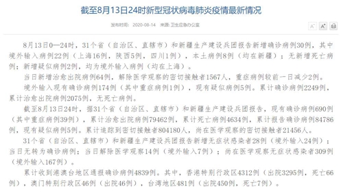 情況顯示,截至8月13日24時(shí),據(jù)31個(gè)?。ㄗ灾螀^(qū)、直轄市)和新疆生產(chǎn)建設(shè)兵團(tuán)報(bào)告,現(xiàn)有確診病例690例(其中重癥病例39例),累計(jì)治愈出院病例79462例,累計(jì)死亡病例4634例,累計(jì)報(bào)告確診病例84786例,現(xiàn)有疑似病例5例。累計(jì)追蹤到密切接觸者804180人,尚在醫(yī)學(xué)觀(guān)察的密切接觸者21456人。