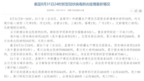 截至8月31日24時(shí),據(jù)31個(gè)?。ㄗ灾螀^(qū)、直轄市)和新疆生產(chǎn)建設(shè)兵團(tuán)報(bào)告,現(xiàn)有確診病例216例(其中重癥病例3例),累計(jì)治愈出院病例80208例,累計(jì)死亡病例4634例,累計(jì)報(bào)告確診病例85058例,無(wú)現(xiàn)有疑似病例。累計(jì)追蹤到密切接觸者815740人,尚在醫(yī)學(xué)觀察的密切接觸者7546人。