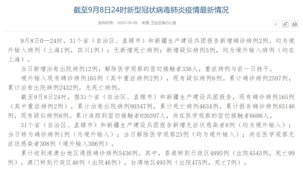 人民網(wǎng)北京9月9日電(董童)國家衛(wèi)生健康委于今日在官網(wǎng)發(fā)布的《截至9月8日24時(shí)新型冠狀病毒肺炎疫情最新情況》(以下簡(jiǎn)稱“情況”)提出,9月8日0—24時(shí),31個(gè)?。ㄗ灾螀^(qū)、直轄市)和新疆生產(chǎn)建設(shè)兵團(tuán)報(bào)告新增確診病例2例,均為境外輸入病例(上海1例,四川1例);無新增死亡病例;新增疑似病例5例,均為境外輸入病例(均在上海)。當(dāng)日新增治愈出院病例12例,解除醫(yī)學(xué)觀察的密切接觸者336人,重癥病例與前一日持平。