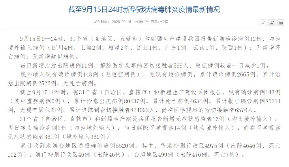 情況顯示,截至9月15日24時,據(jù)31個?。ㄗ灾螀^(qū)、直轄市)和新疆生產(chǎn)建設(shè)兵團報告,現(xiàn)有確診病例143例(其中重癥病例0例),累計治愈出院病例80437例,累計死亡病例4634例,累計報告確診病例85214例,無現(xiàn)有疑似病例。累計追蹤到密切接觸者824092人,尚在醫(yī)學觀察的密切接觸者6576人。