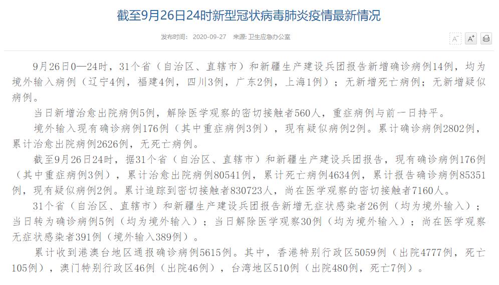 國家衛(wèi)健委:9月26日新增確診病例14例 均為境外輸入病例 |
