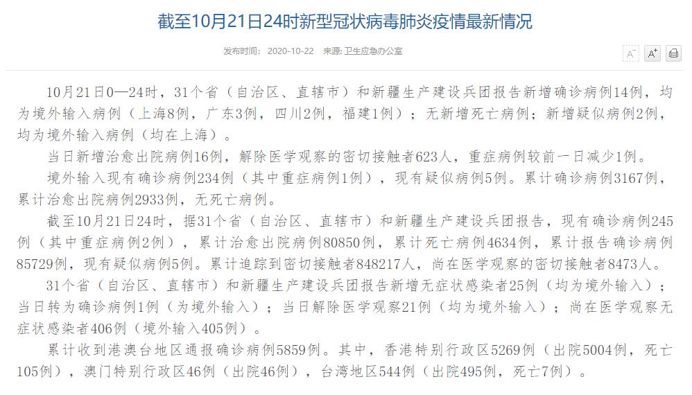 人民網(wǎng)北京10月22日電(董童)國(guó)家衛(wèi)生健康委于今日在官網(wǎng)發(fā)布的《截至10月21日24時(shí)新型冠狀病毒肺炎疫情最新情況》(以下簡(jiǎn)稱“情況”)提出,10月21日0—24時(shí),31個(gè)?。ㄗ灾螀^(qū)、直轄市)和新疆生產(chǎn)建設(shè)兵團(tuán)報(bào)告新增確診病例14例,均為境外輸入病例(上海8例,廣東3例,四川2例,福建1例);無新增死亡病例;新增疑似病例2例,均為境外輸入病例(均在上海)。當(dāng)日新增治愈出院病例16例,解除醫(yī)學(xué)觀察的密切接觸者623人,重癥病例較前一日減少1例。