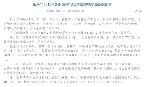 國家衛(wèi)健委:11月19日新增確診病例17例 均為境外輸入病例 |