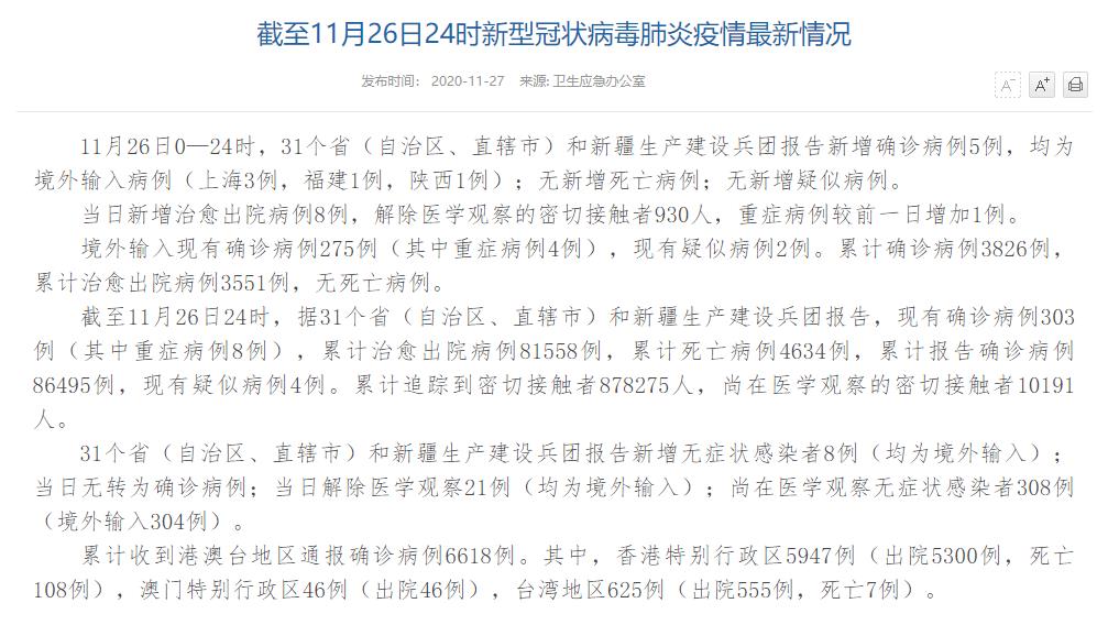 人民網(wǎng)北京11月27日電(董童)國(guó)家衛(wèi)生健康委于今日在官網(wǎng)發(fā)布的《截至11月26日24時(shí)新型冠狀病毒肺炎疫情最新情況》(以下簡(jiǎn)稱“情況”)指出,11月26日0—24時(shí),31個(gè)省(自治區(qū)、直轄市)和新疆生產(chǎn)建設(shè)兵團(tuán)報(bào)告新增確診病例5例,均為境外輸入病例(上海3例,福建1例,陜西1例);無(wú)新增死亡病例;無(wú)新增疑似病例。當(dāng)日新增治愈出院病例8例,解除醫(yī)學(xué)觀察的密切接觸者930人,重癥病例較前一日增加1例。
