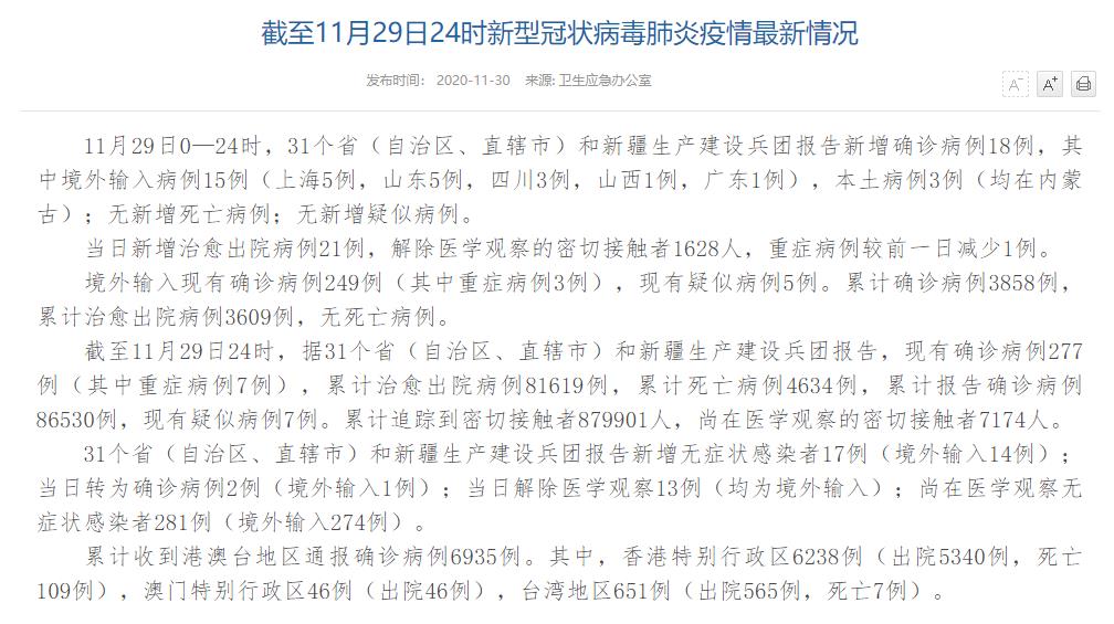 人民網(wǎng)北京11月30日電(董童)國(guó)家衛(wèi)生健康委于今日在官網(wǎng)發(fā)布的《截至11月29日24時(shí)新型冠狀病毒肺炎疫情最新情況》(以下簡(jiǎn)稱“情況”)指出,11月29日0—24時(shí),31個(gè)省(自治區(qū)、直轄市)和新疆生產(chǎn)建設(shè)兵團(tuán)報(bào)告新增確診病例18例,其中境外輸入病例15例(上海5例,山東5例,四川3例,山西1例,廣東1例),本土病例3例(均在內(nèi)蒙古);無(wú)新增死亡病例;無(wú)新增疑似病例。當(dāng)日新增治愈出院病例21例,解除醫(yī)學(xué)觀察的密切接觸者1628人,重癥病例較前一日減少1例。