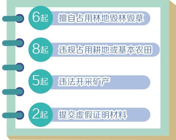 有5起違法開(kāi)采礦產(chǎn):包括河南省南陽(yáng)市南召縣達(dá)康實(shí)業(yè)發(fā)展有限公司以設(shè)施農(nóng)業(yè)為名違法開(kāi)采砂石37萬(wàn)噸;廣西壯族自治區(qū)北流市委、市政府主導(dǎo)推動(dòng)以工程建設(shè)項(xiàng)目施工名義違法開(kāi)采砂石土等。另有2起提交虛假證明材料等違法違規(guī)行為。