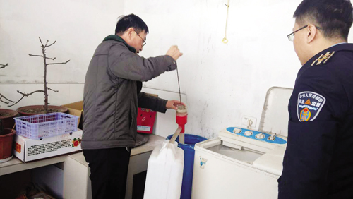 執(zhí)法人員在黑作坊取不合格洗潔精樣品