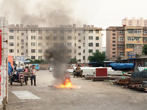 近日,記者途經(jīng)城區(qū)長征西街物資交易市場時,發(fā)現(xiàn)大院里有人正在焚燒垃圾。不小的火堆引起翻滾的濃煙,這一路段瞬間被黑煙籠罩,嚴重影響司機視線,過往行人掩鼻遮口,小心通過。