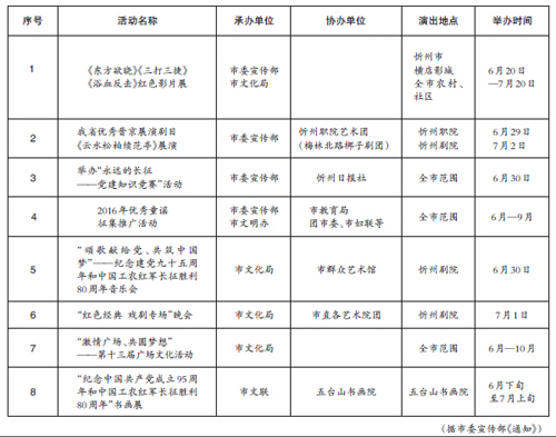 具體活動(dòng)主要包括八項(xiàng)內(nèi)容:1、在忻州橫店影城,全市農(nóng)村、社區(qū)公映紅色愛國主義教育影片。2、我省優(yōu)秀晉京展演劇目《云水松柏續(xù)范亭》展演。3、舉辦“永遠(yuǎn)的長征——黨建知識(shí)競賽”活動(dòng)。4、舉行2016 年優(yōu)秀童謠征集推廣活動(dòng)。5、舉辦“頌歌獻(xiàn)給黨、共筑中國夢”——紀(jì)念建黨95 周年暨紅軍長征勝利80 周年音樂會(huì)。6、舉辦“紅色經(jīng)典、戲劇專場”晚會(huì)。7、開展“激情廣場、共圓夢想”——第十三屆廣場文化活動(dòng)。8、舉辦“紀(jì)念建黨95 周年暨紅軍長征勝利80 周年”書畫展。