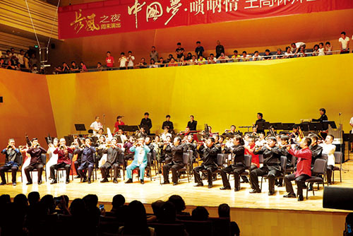 6月18日下午,王高林老師攜其愛徒,在山西省歌舞劇院黃河劇場還進行了《王高林師生嗩吶藝術學術交流講座》活動。圖為6月17日晚,在山西大劇院“《中國夢·嗩吶情》王高林師生嗩吶音樂會”演出現(xiàn)場(劉捷 志遠 王菲)