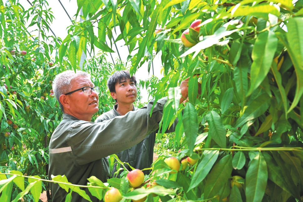 河曲縣榆嶺窊村技術人員觀察果樹長勢與掛果情況。 本報記者馮曉磊攝