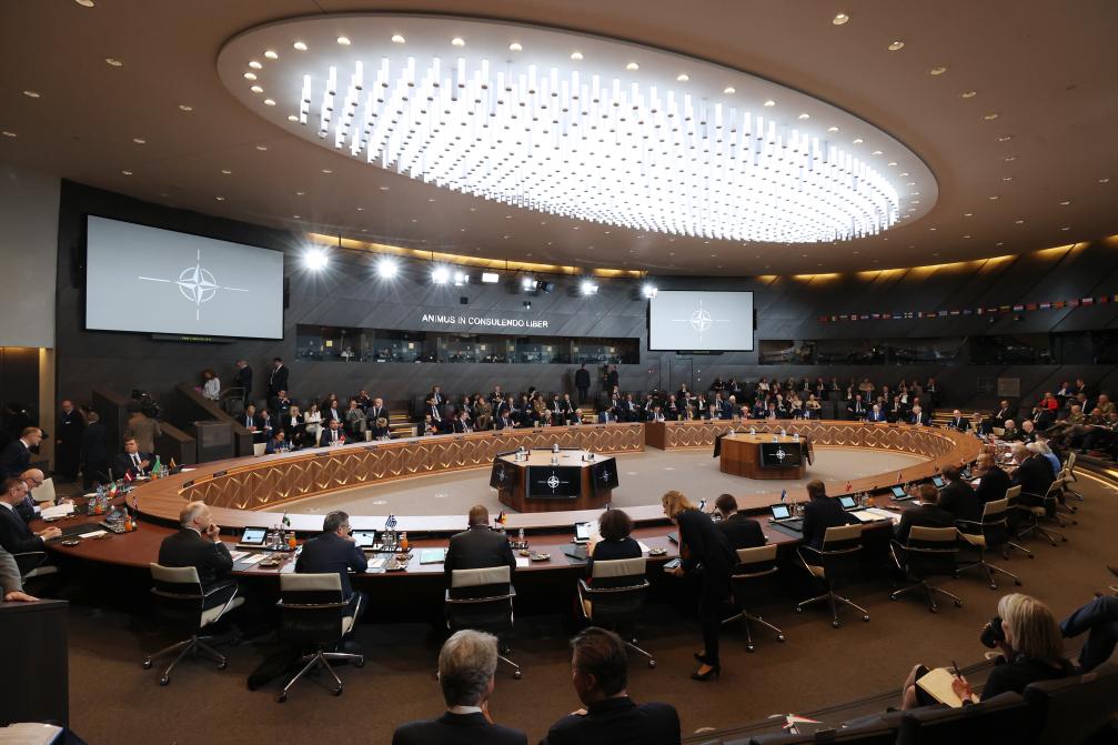 這是6月14日在比利時(shí)布魯塞爾北約總部拍攝的北約防長(zhǎng)會(huì)現(xiàn)場(chǎng)。北約秘書長(zhǎng)斯托爾滕貝格14日說,北約成員國(guó)國(guó)防部長(zhǎng)當(dāng)天批準(zhǔn)了一項(xiàng)旨在由北約協(xié)調(diào)對(duì)烏克蘭軍事援助和訓(xùn)練的計(jì)劃。北約防長(zhǎng)會(huì)13日至14日在布魯塞爾舉行。新華社記者趙丁喆攝