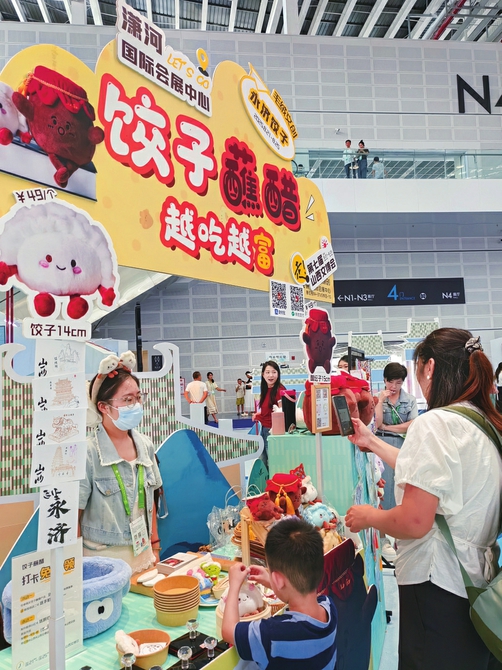 胖乎乎的餃子、圓墩墩的醋缸,摸一摸,毛絨絨的,手感柔順細滑。8月24日,第七屆山西文博會現(xiàn)場,位于山西瀟河國際會展中心N4館的文創(chuàng)山西展區(qū),永濟市晉韻原創(chuàng)文創(chuàng)工作室獨特而醒目的門頭——“餃子蘸醋 越吃越富”,吸引了眾多參觀者的目光。該工作室展出的餃子蘸醋系列毛絨文創(chuàng)產(chǎn)品,也受到參觀者的關注和喜愛。