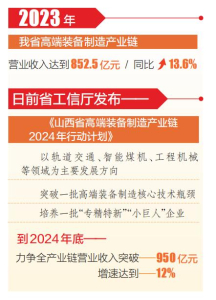 省工信廳日前發(fā)布《山西省高端裝備制造產(chǎn)業(yè)鏈2024年行動計劃》,確立年度推進目標:以軌道交通、智能煤機、工程機械等領域為主要發(fā)展方向,突破一批高端裝備制造核心技術瓶頸,培養(yǎng)一批“專精特新”“小巨人”企業(yè),提升全產(chǎn)業(yè)鏈科技創(chuàng)新能力,強化高端裝備制造供應鏈穩(wěn)定性和配套能力。并提出,到2024年底,力爭全產(chǎn)業(yè)鏈營業(yè)收入突破950億元,增速達到12%。