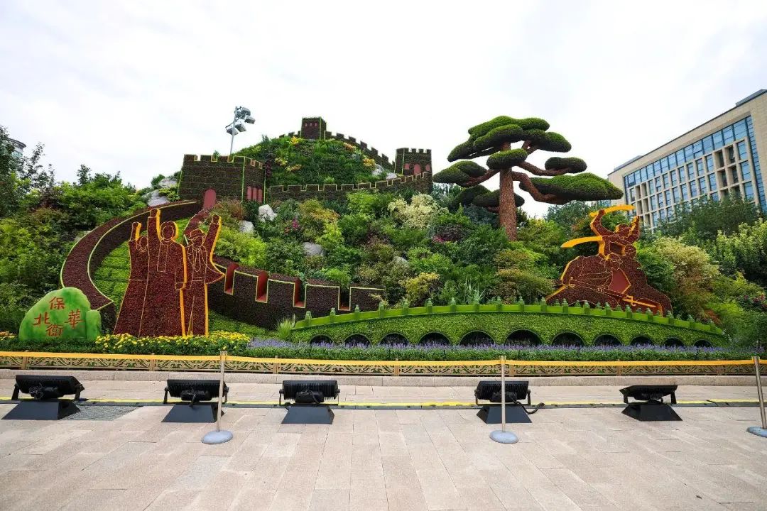 地面花卉布置融合規(guī)則式與自然式風(fēng)格,平型關(guān)下方的粉色小路采用穴盤苗栽植工藝,精選舞春花‘影子’與五色草綠草進(jìn)行精細(xì)配置,既呈現(xiàn)出細(xì)膩的造型質(zhì)感,又豐富了地面景觀的觀賞性?;▔校€應(yīng)用了谷子、棗樹,呈現(xiàn)經(jīng)典歷史場景。