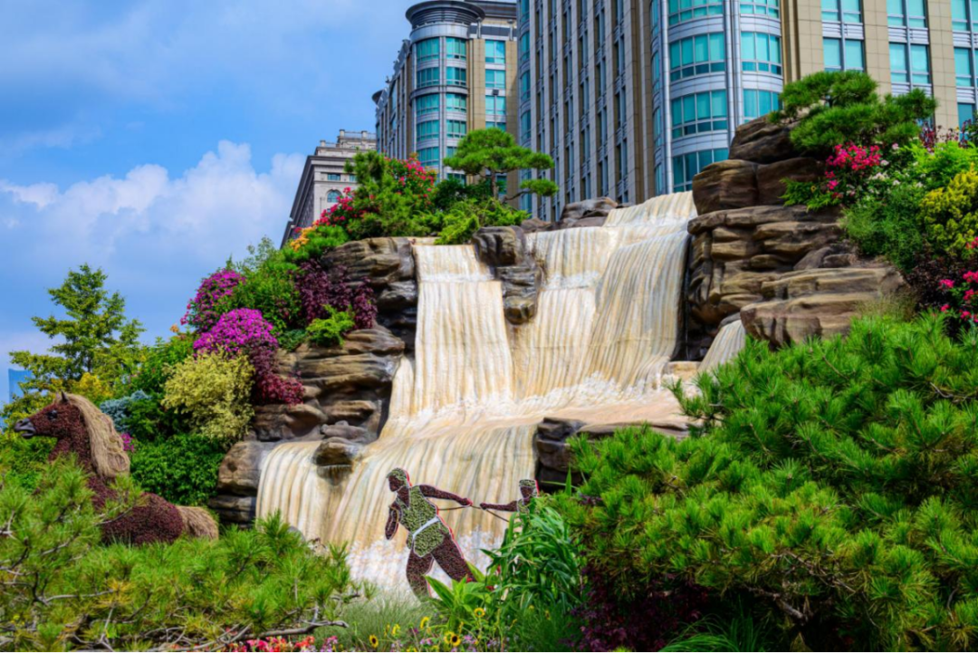 花壇主景的瀑布、山石采用玻璃鋼工藝,彩繪的瀑布與真水、迷霧共同呈現(xiàn)壺口瀑布壯闊的景觀。群馬采用穴盤苗栽植工藝。造型松、龍柏、錦帶等二十余種喬灌木塑造了豐富自然的山體景觀。